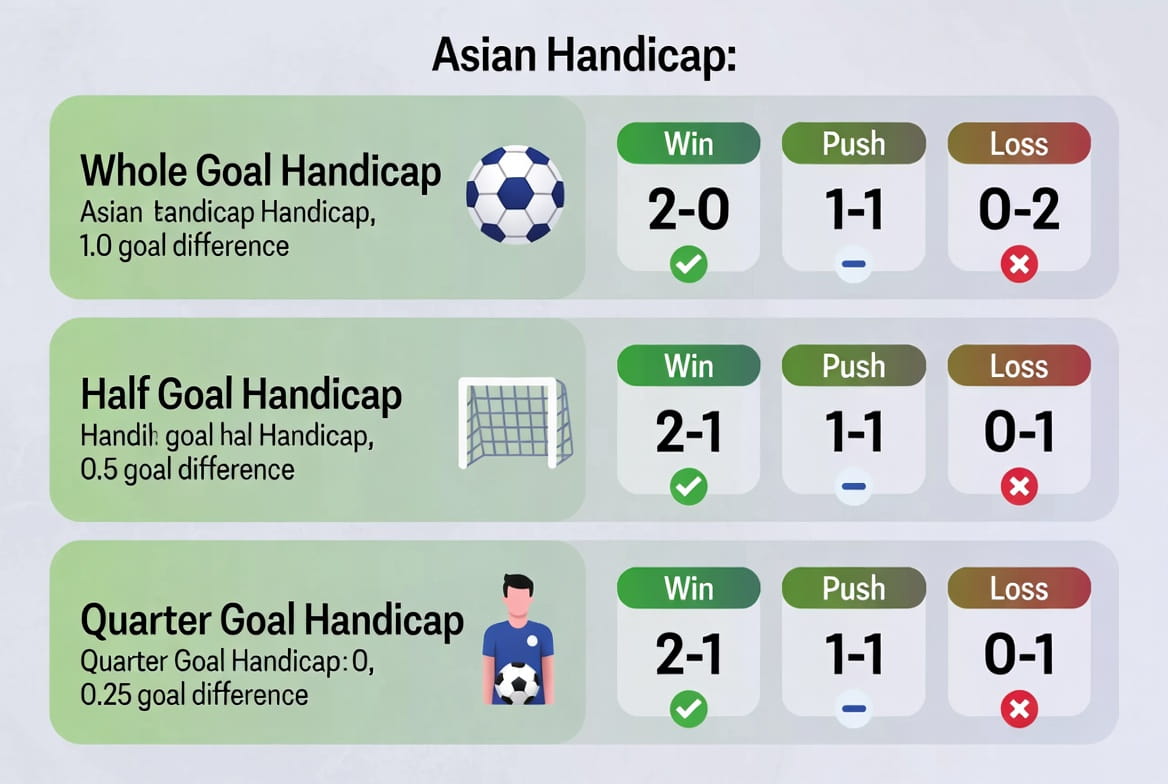 El hándicap asiático (también llamado Asian Handicap) es un sistema de apuesta donde un equipo recibe una ventaja o desventaja virtual en goles (o en puntos). A diferencia del hándicap europeo clásico, el hándicap asiático permite recuperar una parte o la totalidad de tu apuesta en caso de empate (draw no bet).